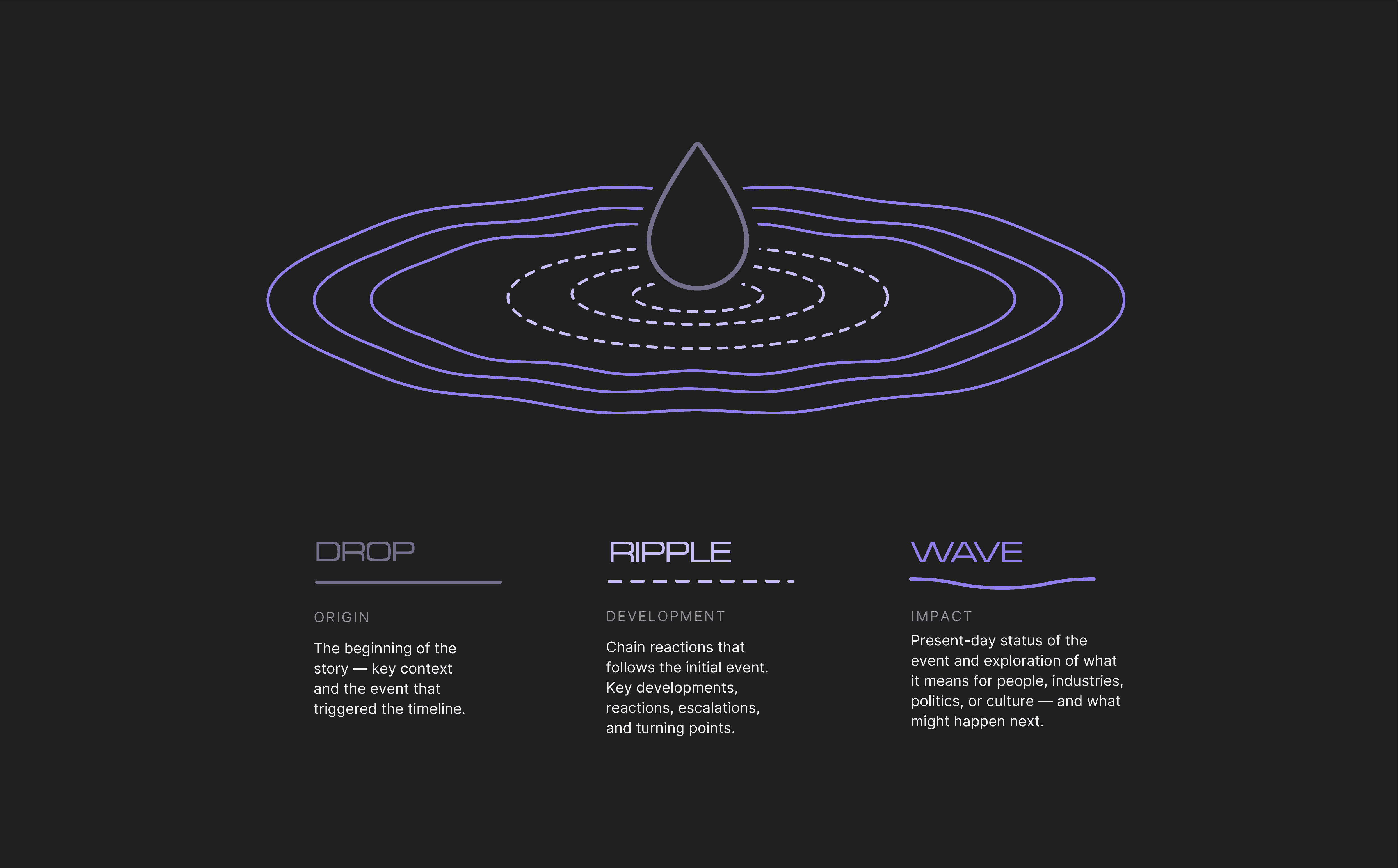 Structured around the metaphor of a ripple effect, each news story is broken into three digestible sections: Drop (where it started), Ripple (how it unfolded), and Wave (its current impact).