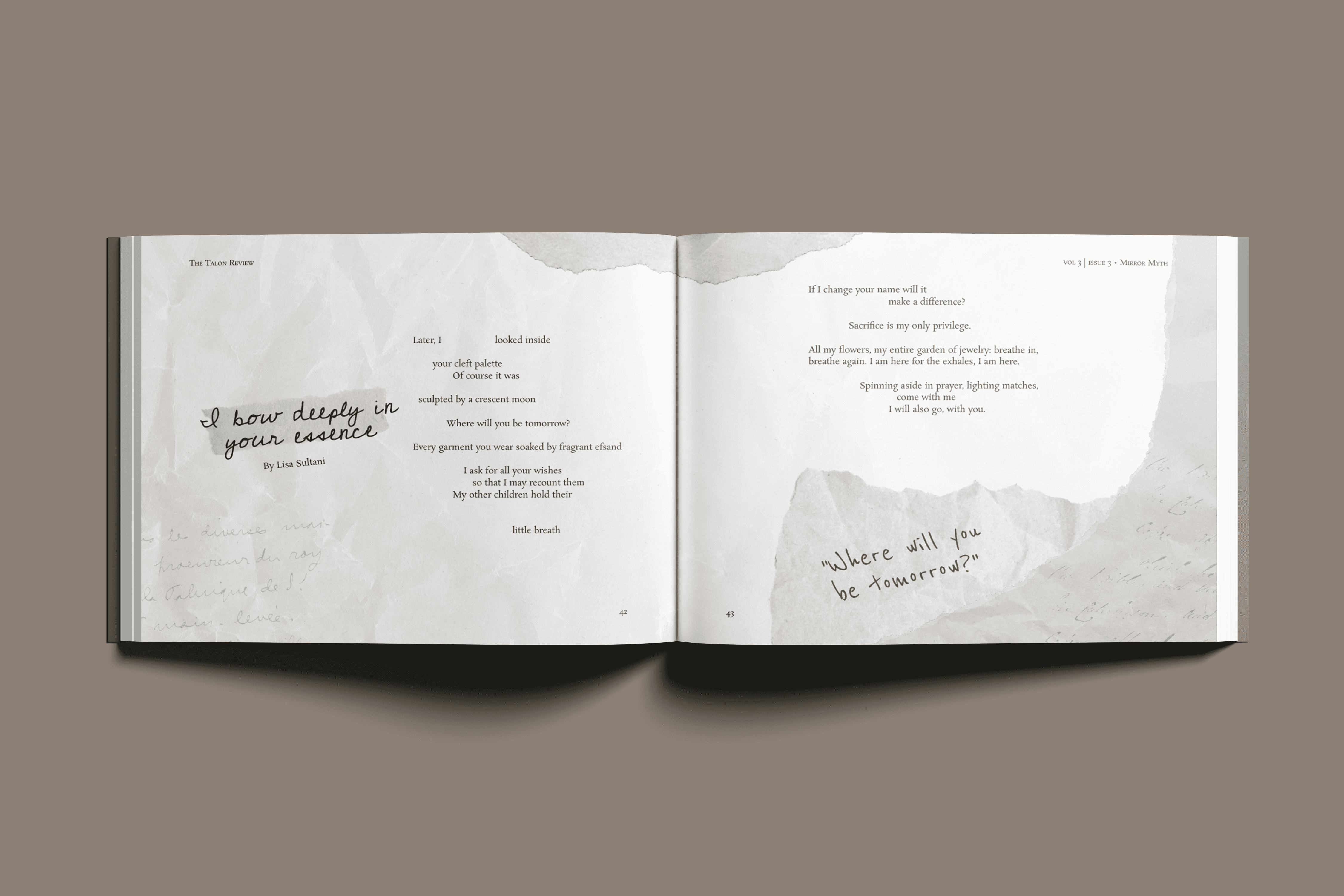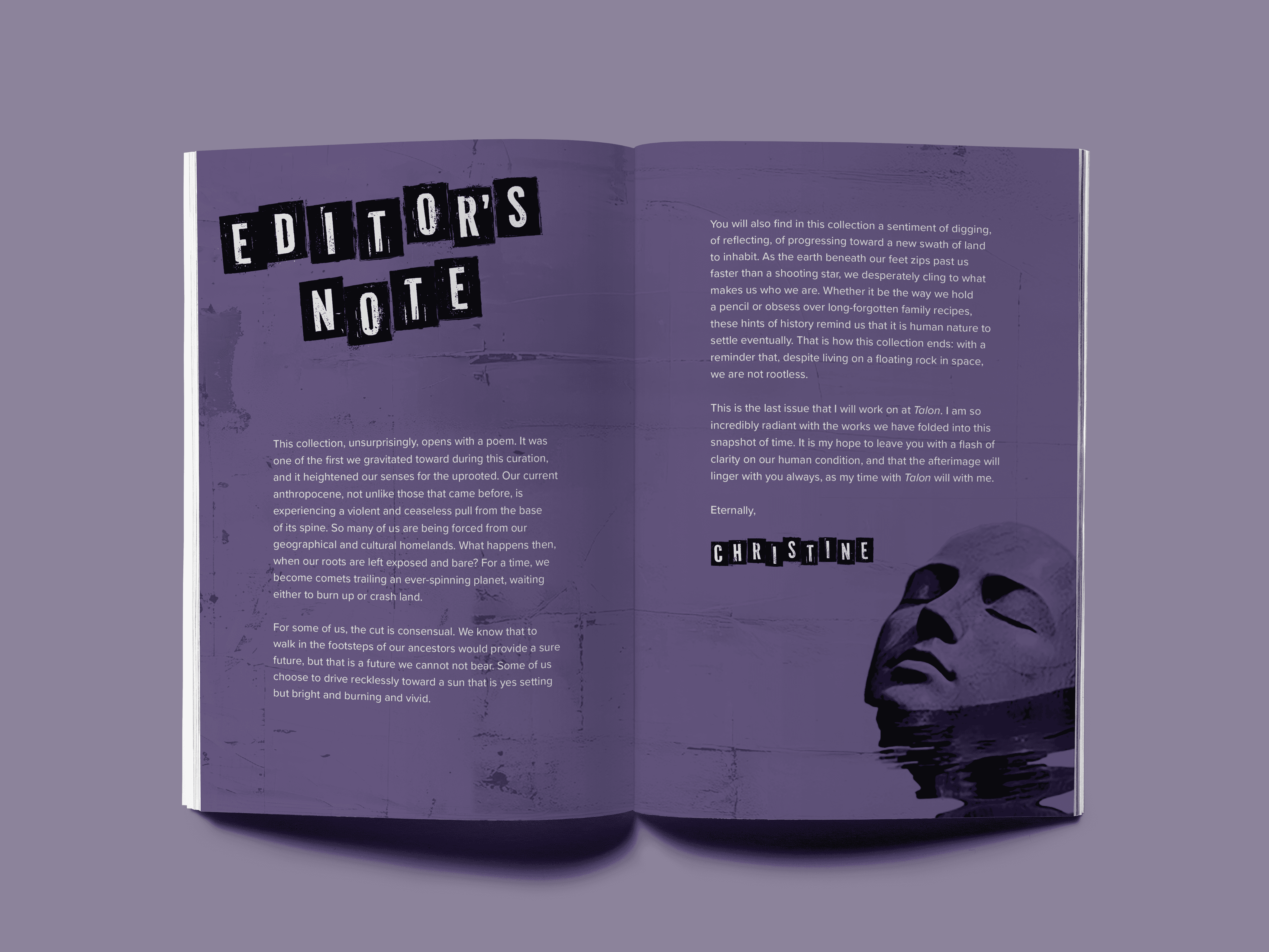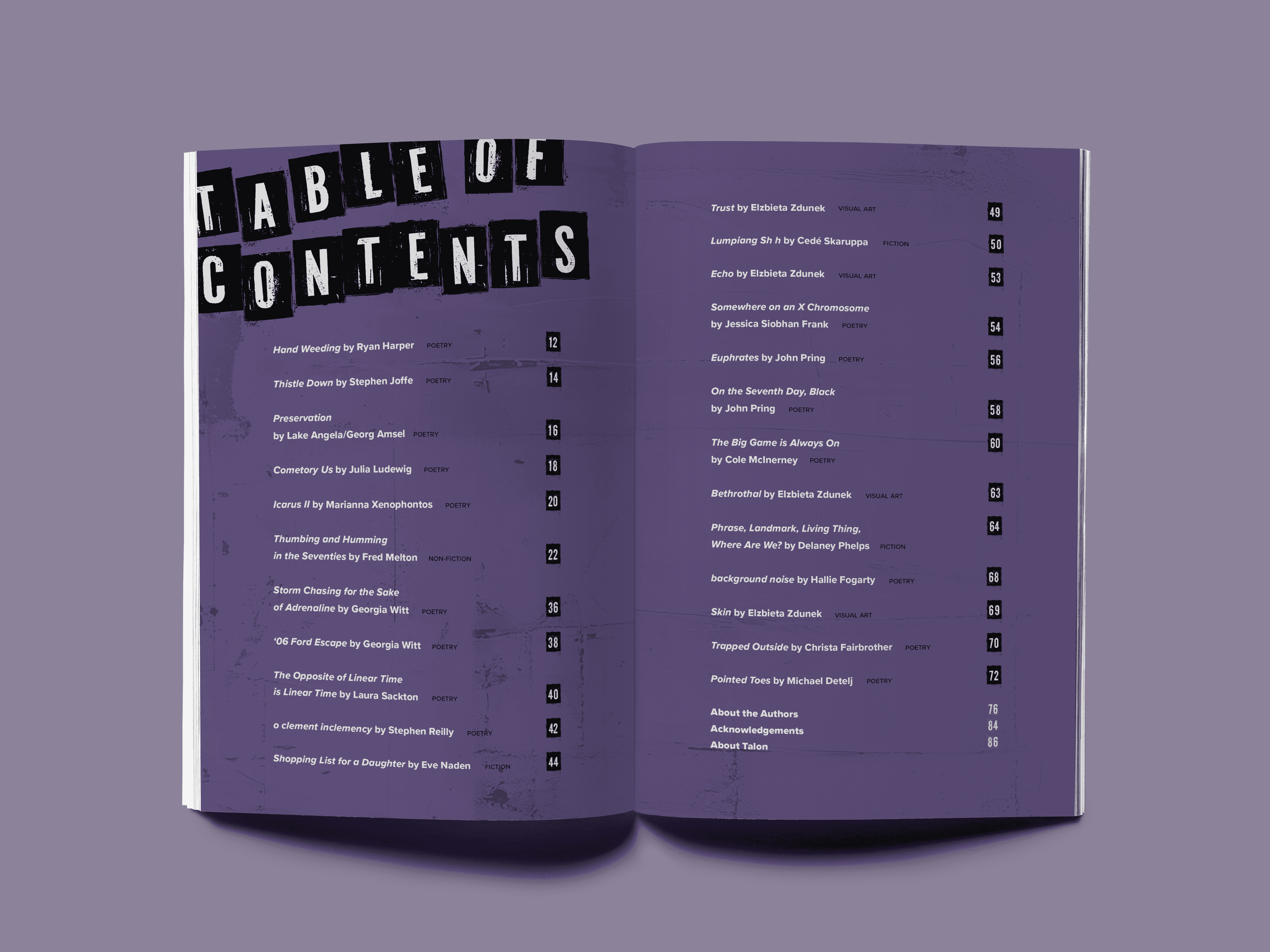 As designer for The Talon Review for three issues, I translated each editorial theme into a visual language. Through thoughtful typography, composition, and collaboration with editors and artists, I created publication designs that merge storytelling and design