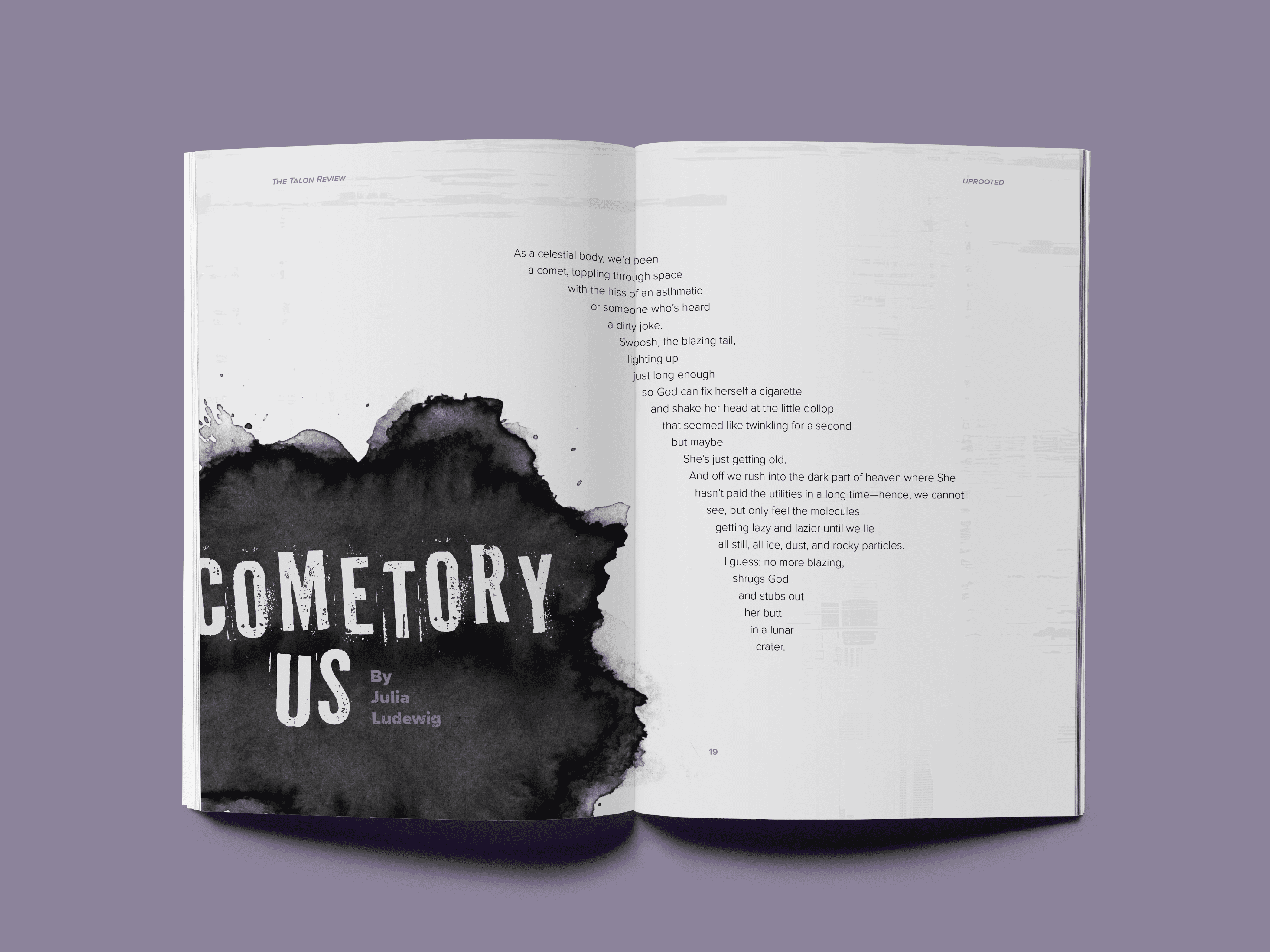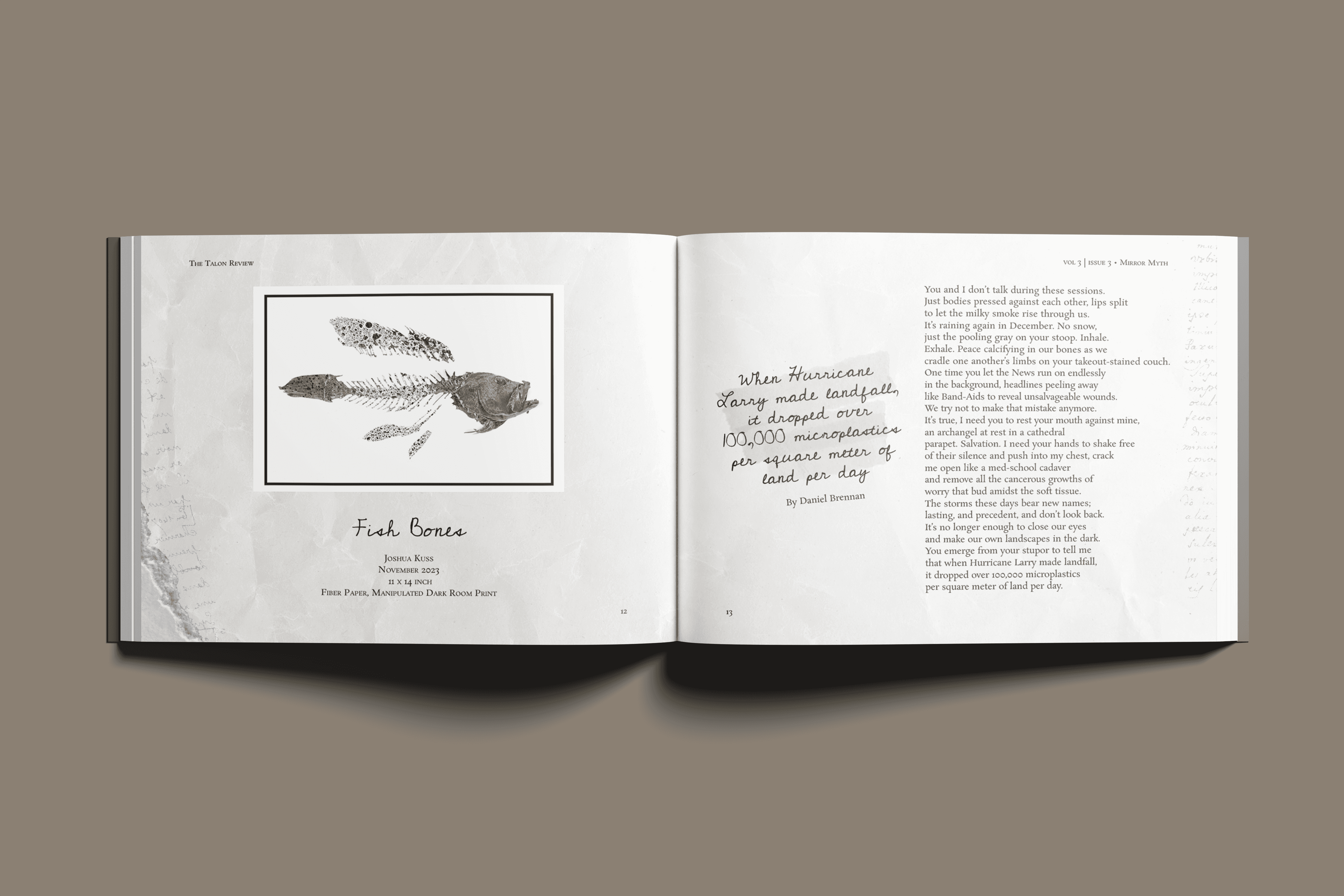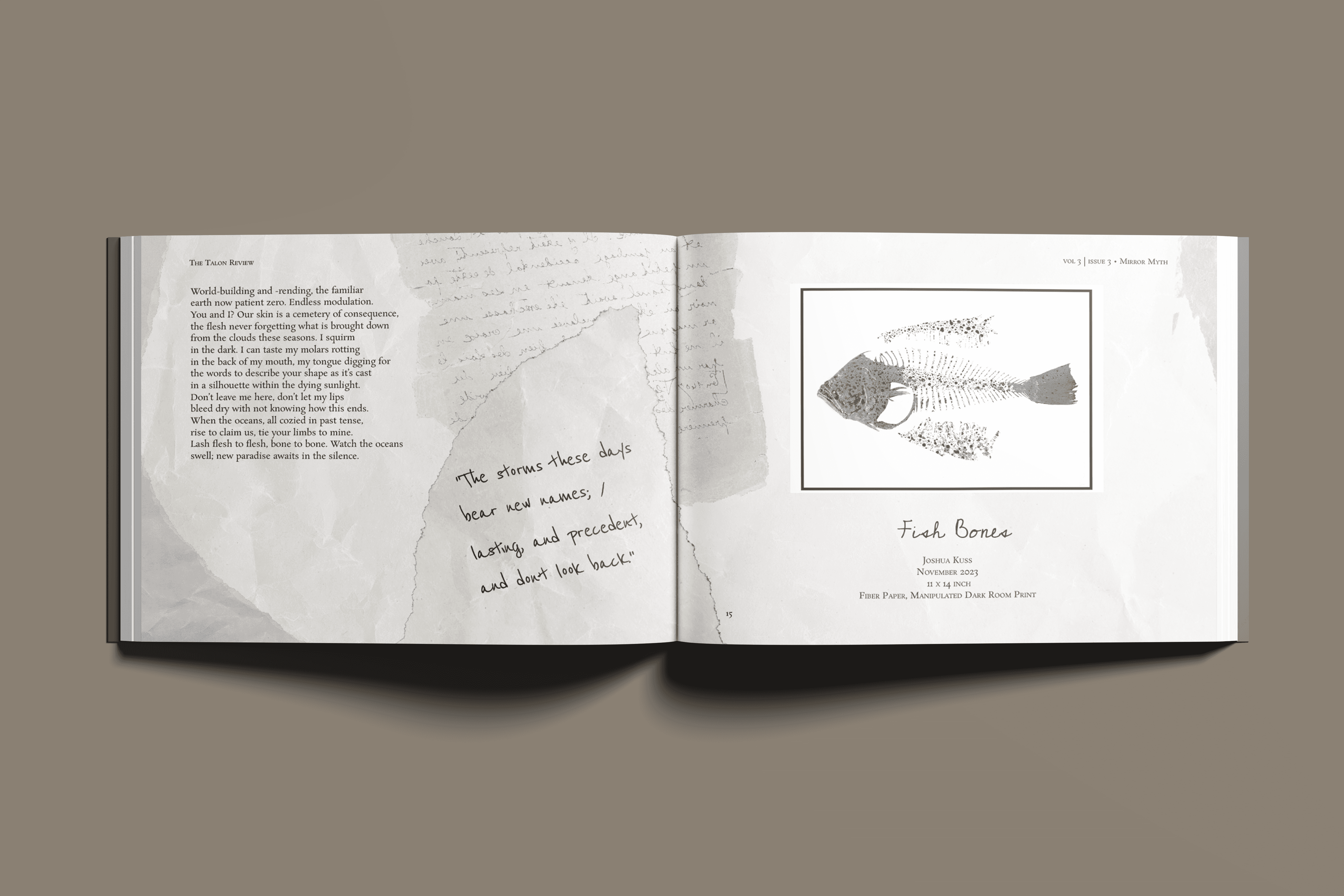 As designer for The Talon Review for three issues, I translated each editorial theme into a visual language. Through thoughtful typography, composition, and collaboration with editors and artists, I created publication designs that merge storytelling and design